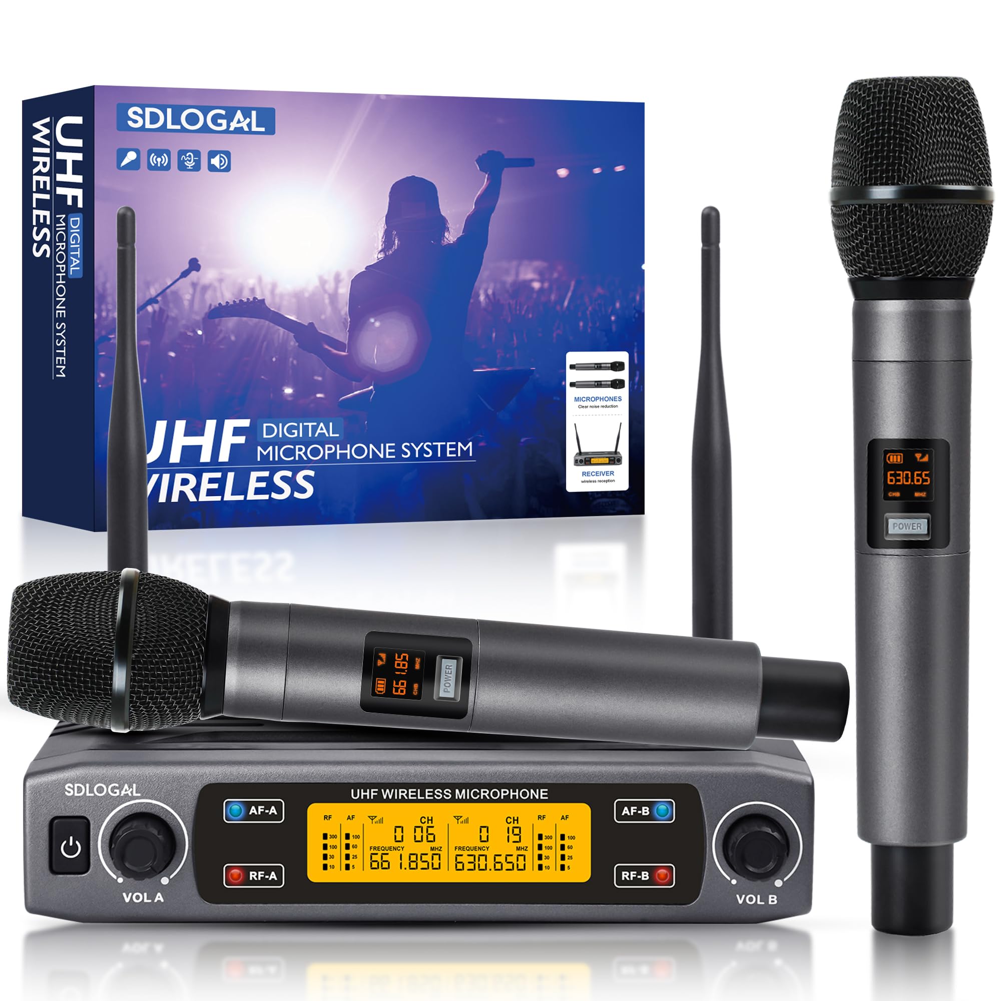 Image: The sdlogal L93-Y-202 Dynamic Wireless Microphone System, showing two handheld microphones and the receiver unit.